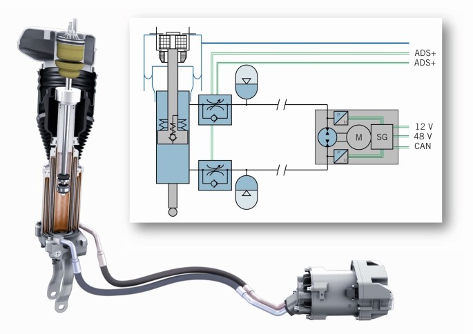 - ระบบโช้คอัพไฟฟ้า โดยการควบคุมขนาดของวาวล์ระบายน้ำมันจากการสั่งการของสมองกล ซึ่งรับข้อมูลเซ็นเซอร์หลายๆจุดให้ทำหน้าที่ตรวจจับเสถียรภาพของตัวรถและวัดสถาพพื้นผิวบนถนนฝั่งด้านหน้ารถ (มีเฉพาะรถบางรุ่น) คอยปรับเพิ่มหรือลดขนาดวาวล์ซึ่งจะส่งผลต่ออัตราการไหลของน้ำมันโดยตรง ระบบนี้มีหลายชื่อด้วยกันตามค่ายผู้พัฒนาระบบ เช่น Adaptive Damper System, Active Body Control, Magic Body Control เป็นต้น