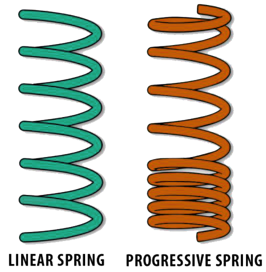 2. Progressive Spring คือคอยล์สปริงที่มีระยะห่างแต่ละขดไม่เท่ากันเลย จะมีระยะห่างระหว่างขดเพิ่มขึ้นเรื่อยๆ ซึ่งค่า K ของแต่ละขดจะไม่เท่ากัน ซึ่งคอยล์สปริงแบบนี้จะค่อยๆเพิ่มความแข็งขึ้น ไปจนถึงค่า K สูงสุด ทำให้เวลาขับช้าก็จะนุ่ม และยิ่งเร็วยิ่งแข็งขึ้นตามลำดับอย่างต่อเนื่อง