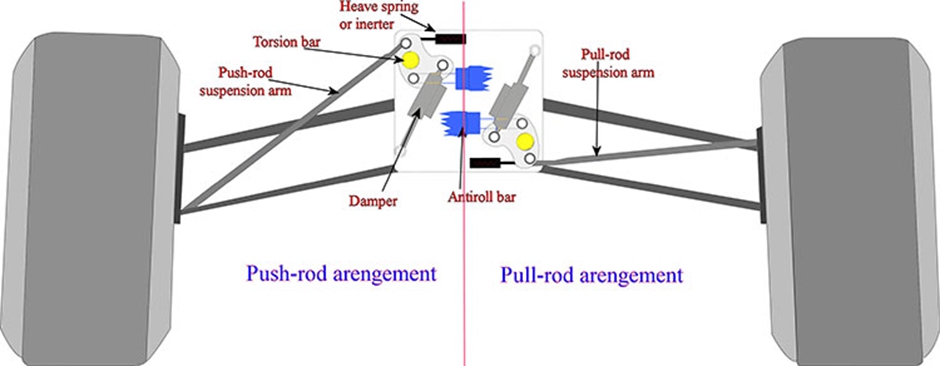 โครงสร้างช่วงล่างแบบ Push-rod ด้านซ้าย และ Pull-rod ด้านขวา